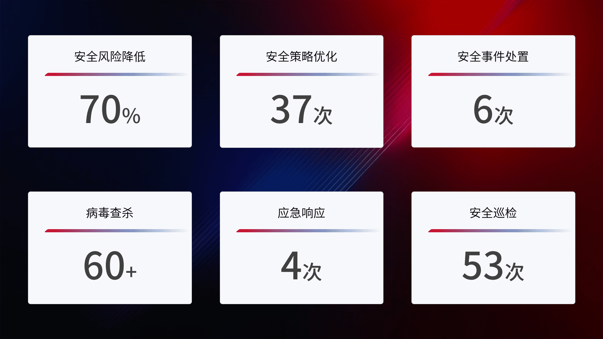 提供全面的安全事件报告体系,,,包括处置报告、、、、周报、、季度和年度总结,,,结合持续监控,,,,帮助客户深入了解网络安全状况。。。